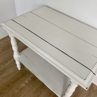 Once I was satisfied with the application of the white paint, I distressed curvature points, lines in the table portion, and the bottom of the table to make it more iridescent. The distressing brings out the beautiful woodwork and emphasizes the details of the piece: